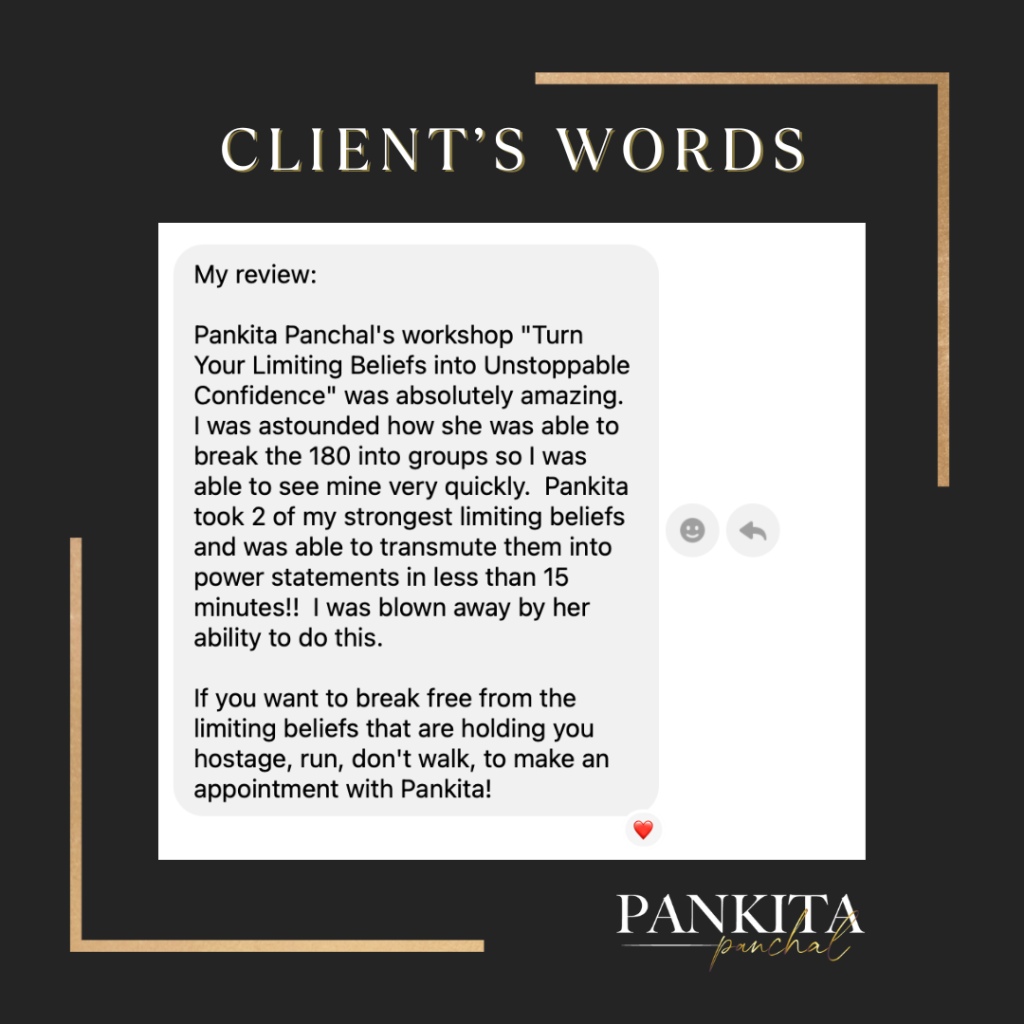 By clarifying my limiting beliefs and redefining my values, I now know exactly what I need to do and what strategies I need. This was by far one of the best investments I ever made. I feel like I can now move forward with confidence and reach my goals that have been out of my reach for so long. Thank you very much and I really appreciate your help, Pankita. Highly recommend Pankita Panchal.