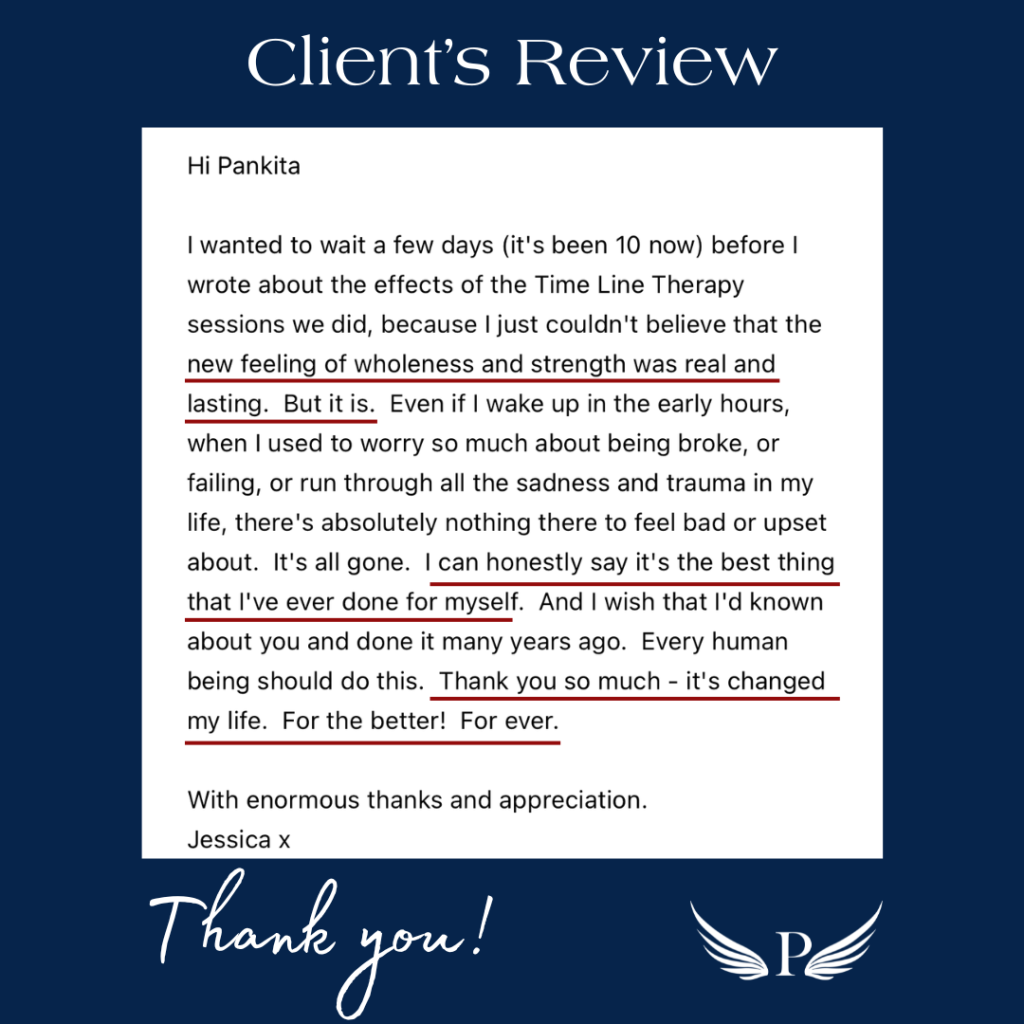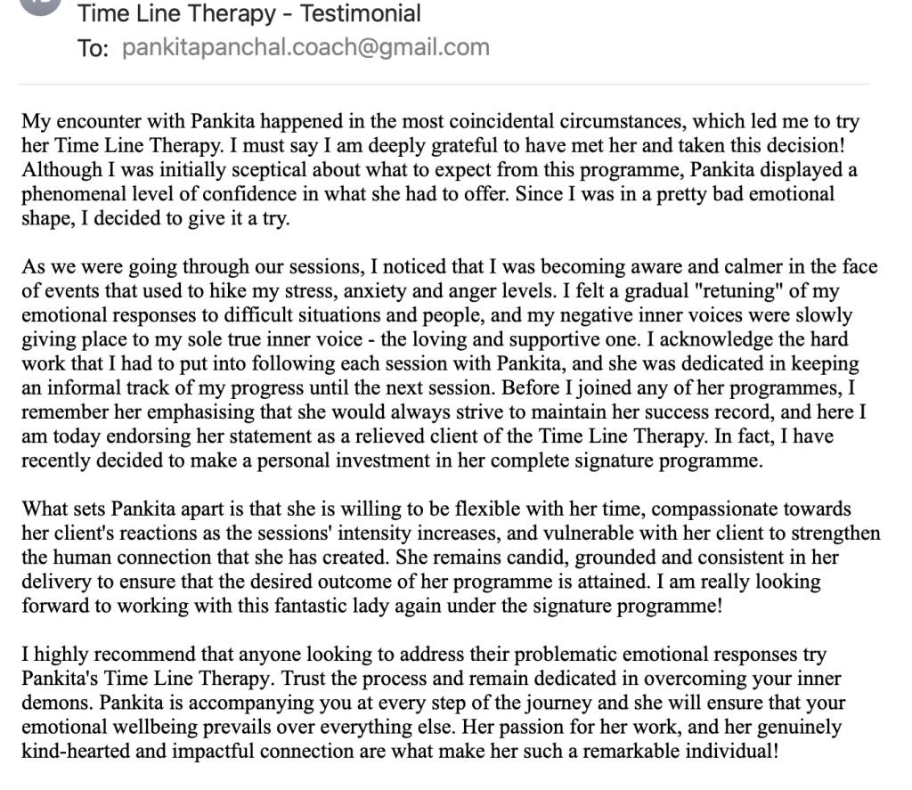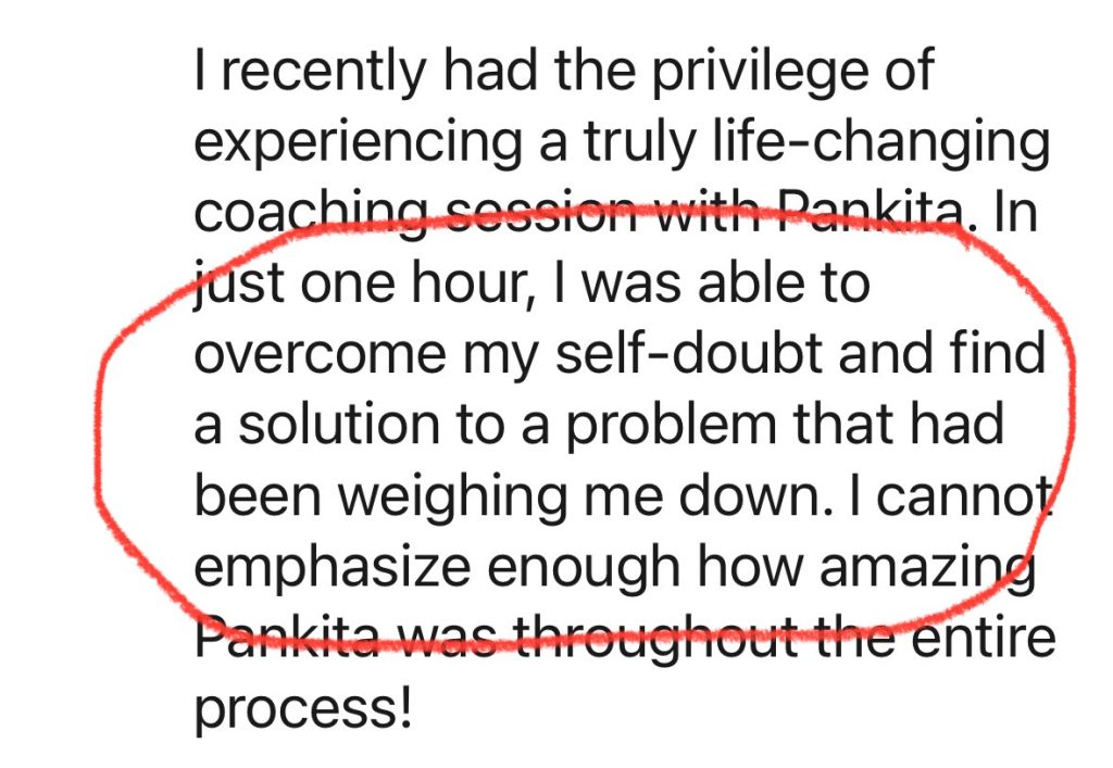 “What can I say about this truly gifted life coach. Pankita is patient and held a safe space for me to express my deepest self. We got to the root of one of my limiting beliefs, which was affecting my progress in life. She used a specialised technique which actually worked. I can’t thank you enough Pankita.”