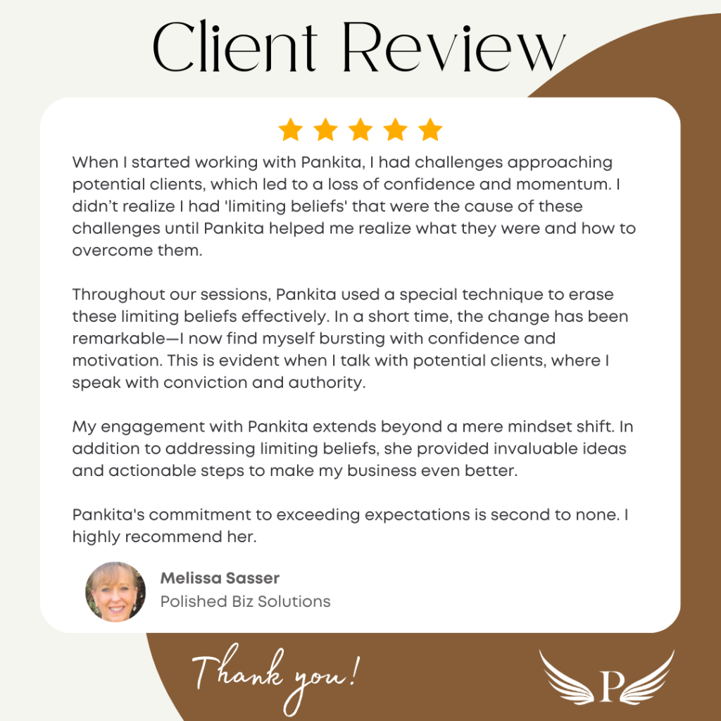 I just completed Pankita’s coaching program, and I have to say that this is one of the best decisions I’ve made. Pankita genuinely cares and helps you completely. She took me through the journey of overcoming self-limiting beliefs and changing my value hierarchy, which made a real difference in my business. I would highly recommend her to anybody who is willing to grow and take effort to make a change in their own business.