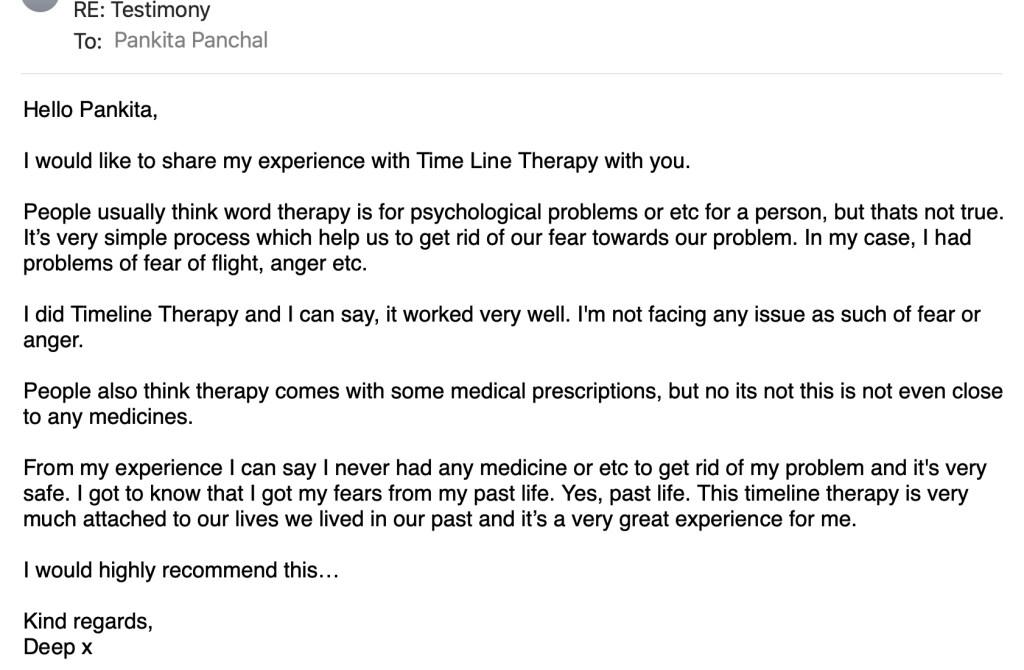 “I felt really positive and focused after doing the Confidence and self belief technique. It’s amazing how the image I had in my subconscious had disappeared. Thank you so much, Pankita.”
